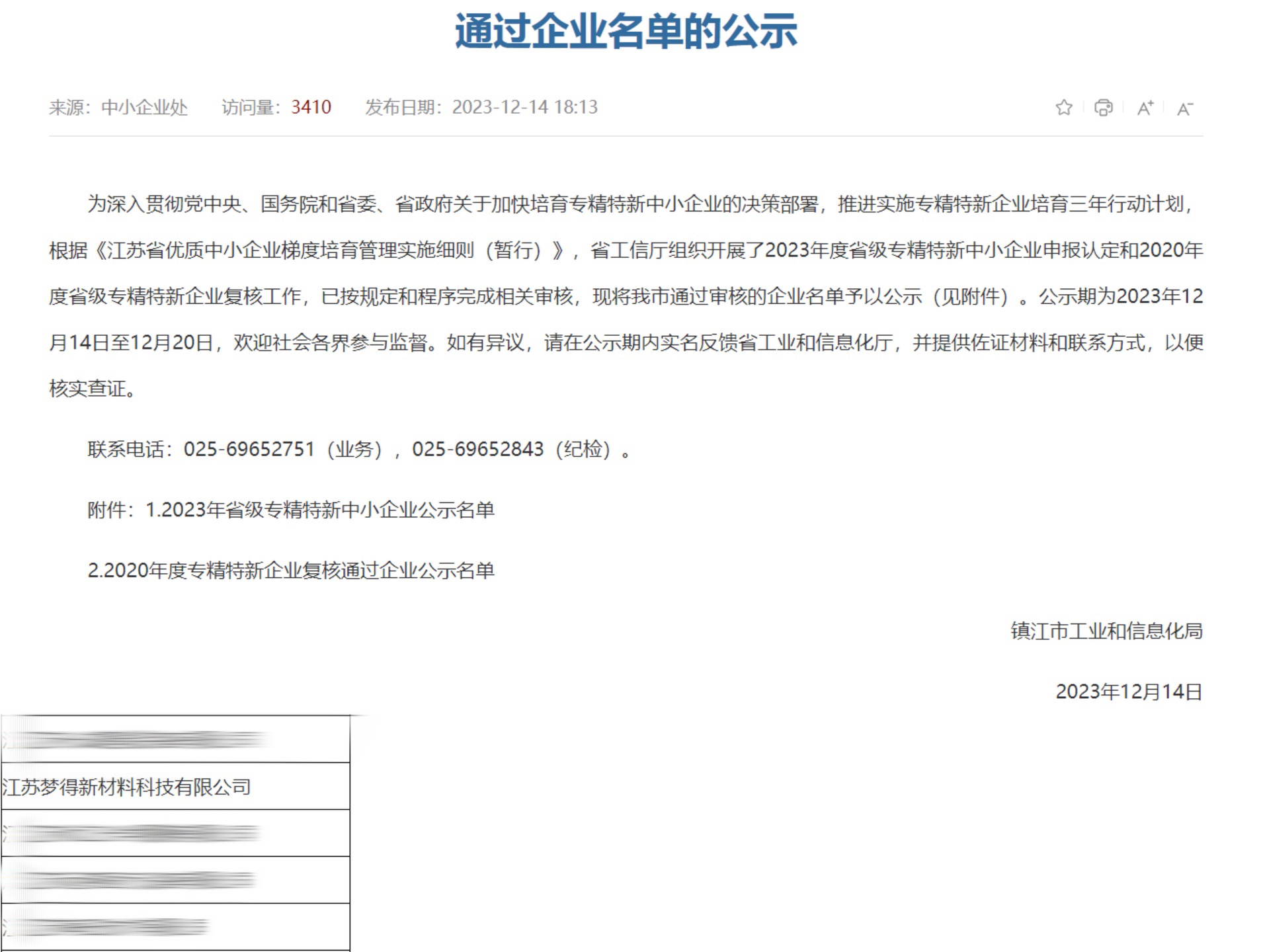 2023年12月14日,江蘇省工業和信息化廳發布《關於(yú)江蘇省2023年專精特新中小企業和2022年度專精特新企業複核通過企業名單(dān)的公示》,江蘇夢得新材料科技有限公司成功入選2023年江蘇省省級專精特新中小企業名單(dān) 。