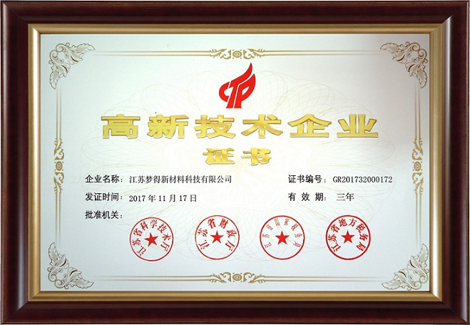 祝賀江蘇夢得獲得高新技術企業證書認證,由江蘇夢得新材料科技有限公司於2018.02.10整理發布。